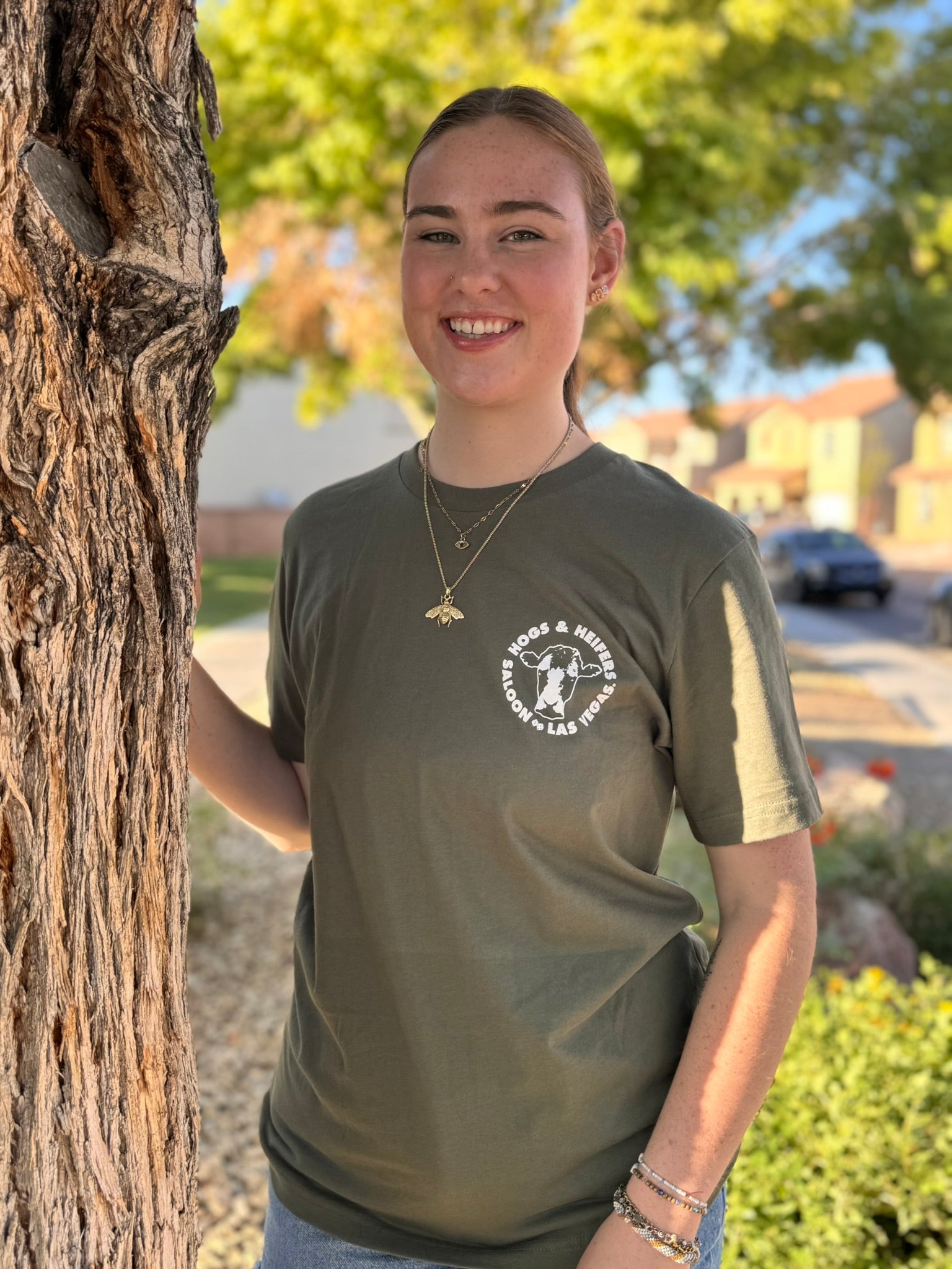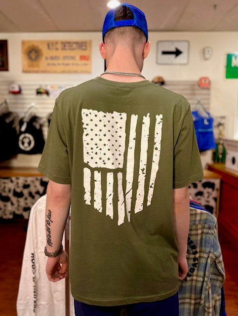 Army green T-shirt featuring a white USA flag on back. Great way to show your Patriotic pride and look cool representing your favorite Saloon.