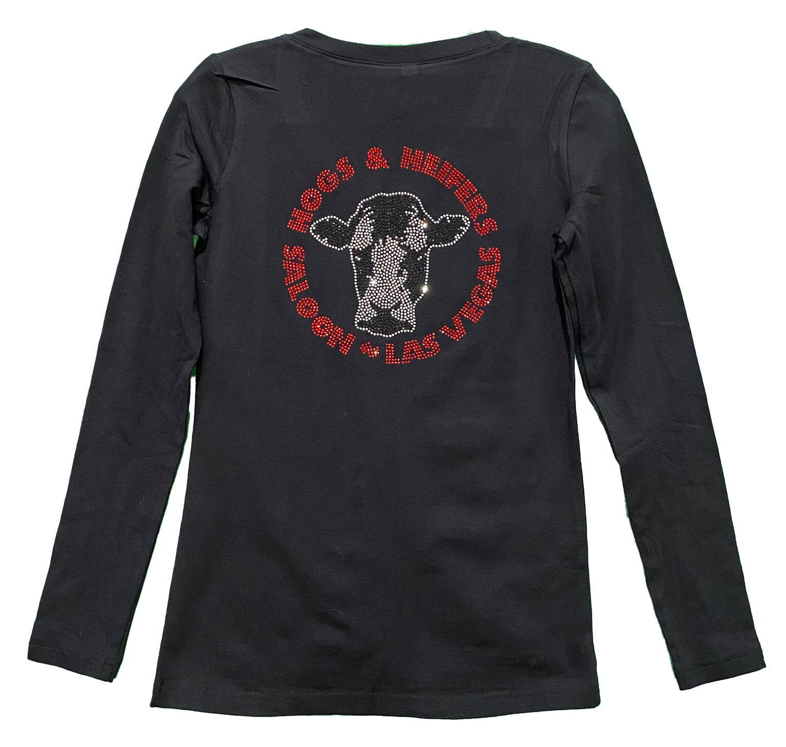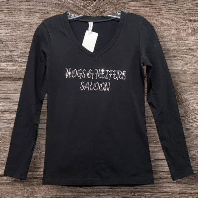 Make a bold statement with our form fitting BLING LOGO LONG SLEEVE V NECK. This stylish design combines comfort and versatility, making it perfect for any occasion. Add a touch of sparkle to your wardrobe and stand out from the crowd with this must-have piece!