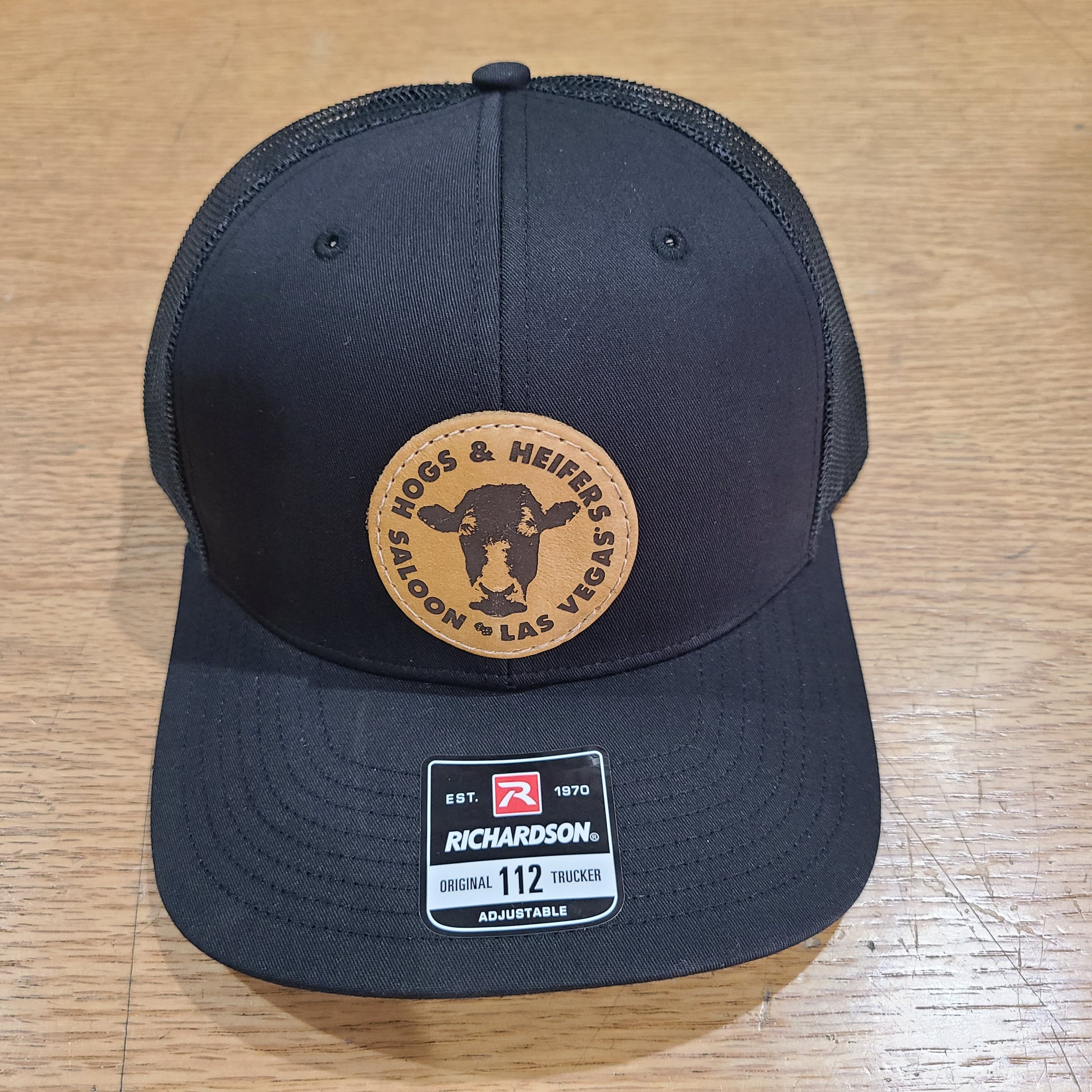 Richardson Trucker Snapback Hat, Black on Black mesh back with round leather patch on front with Hogs & Heifers Saloon logo.
