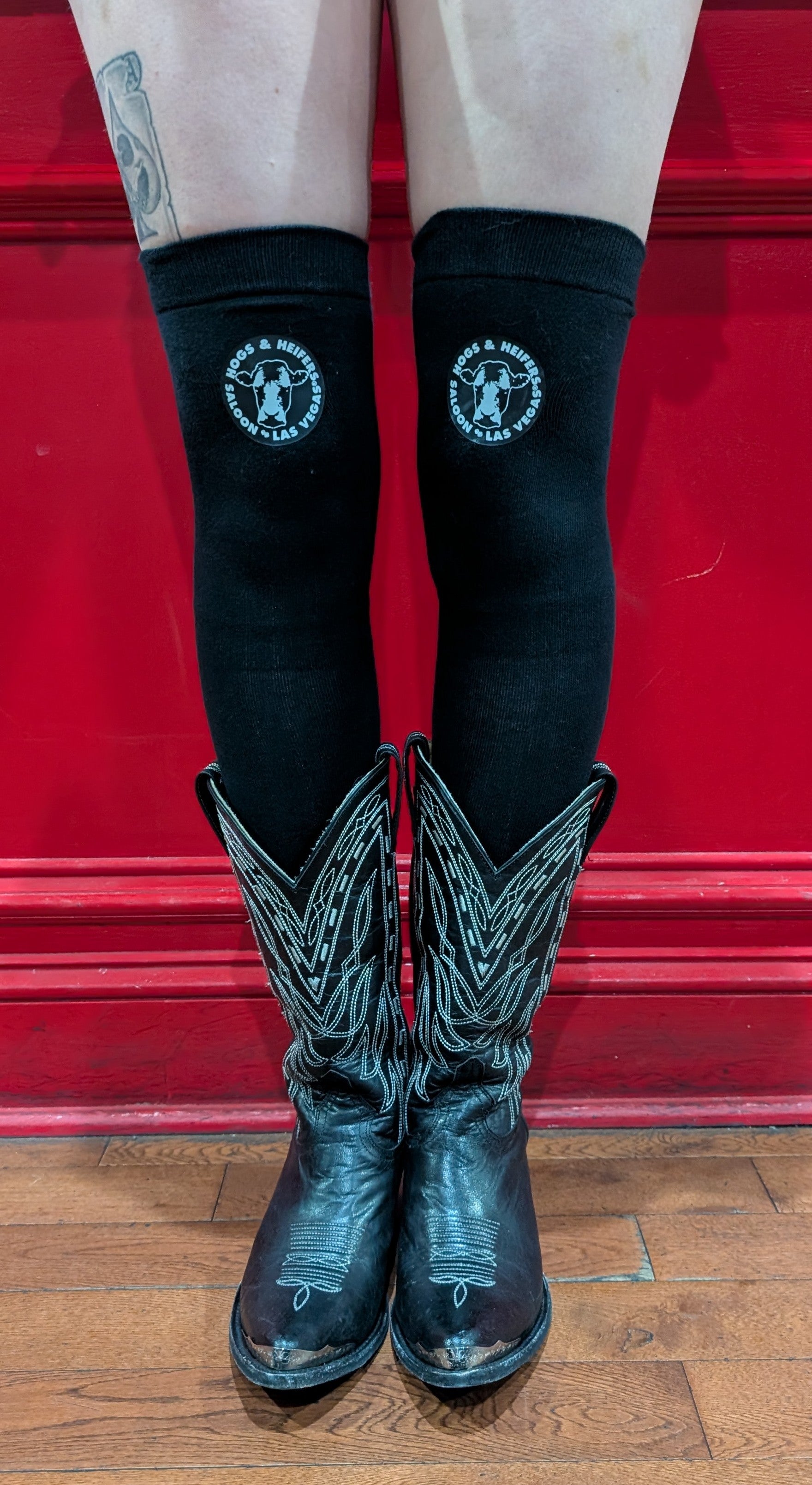 Step up your sock game with these sexy polyester over the knee socks featuring the iconic Hogs logo. Perfect for adding a touch of style and personality to any outfit. Get your pair now and strut your stuff with confidence! One size fits most.